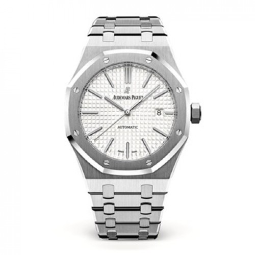 La montre Audemars Piguet Royal Oak (réf. 15400ST.OO.1220ST.02) est dotée du mouvement mécanique automatique AP Calibre 3120 avec une réserve de marche d'environ 60 heures; cadran argenté avec motif "Grande Tapisserie" gravé et index appliqués en or blanc; guichet de date à 3 heures; trotteuse au centre; verre saphir, fond transparent; et 41 mm (9.8 mm d'épaisseur), boîtier en acier inoxydable brossé sur un bracelet en acier inoxydable brossé avec un fermoir déployant à bouton-poussoir.