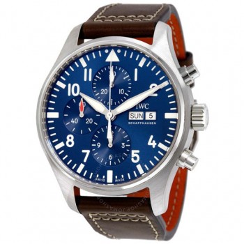 Boîtier en acier inoxydable avec un bracelet en cuir de veau marron. Lunette fixe en acier inoxydable. Cadran bleu nuit avec aiguilles argentées lumineuses et index des heures en chiffres arabes. Marqueurs minutes autour du bord extérieur. Type de numérotation: analogique. Aiguilles et marqueurs luminescents. Affichage du jour de la semaine et de la date à la position 3 heures. Chronographe - trois sous-cadrans affichant: 60 secondes, 30 minutes et 12 heures. Mouvement automatique IWC calibre 79320 avec une réserve de marche de 44 heures. Verre saphir résistant aux rayures. Couronne vissée. Fond de boîtier solide. Taille du boîtier: 43 mm. Épaisseur du boîtier: 15 mm. Forme ronde du boîtier. Fermoir Tang. Résistant à l'eau à 60 mètres / 200 pieds. Fonctions: chronographe, date, jour de la semaine, heure, minute, seconde. Style de montre de luxe. Étiquette de la montre: Swiss Made. Montre IWC Pilot's édition chronographe Le Petit Prince IW377714.