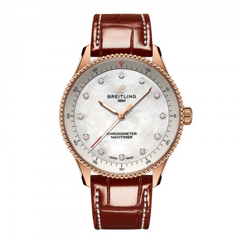 À propos de la Breitling Navitimer 32 mm Femme Blanche Bracelet en nacre et crocodile, or rouge 18 carats R77320E61A1P1