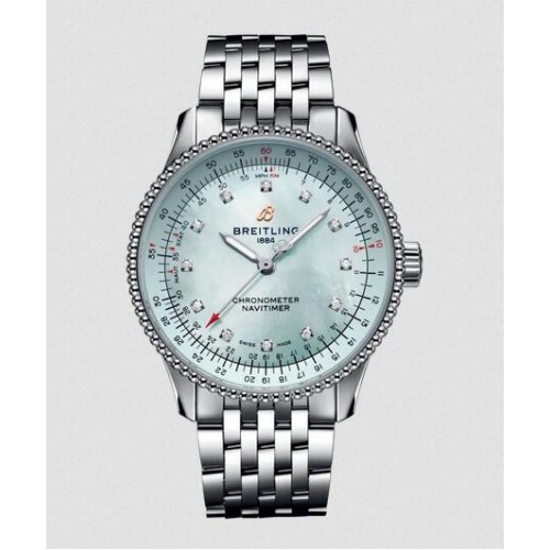 Raffinée et élégante, cette Navitimer Automatic 35 en édition limitée est dotée d'un cadran en nacre bleu clair serti de diamants.