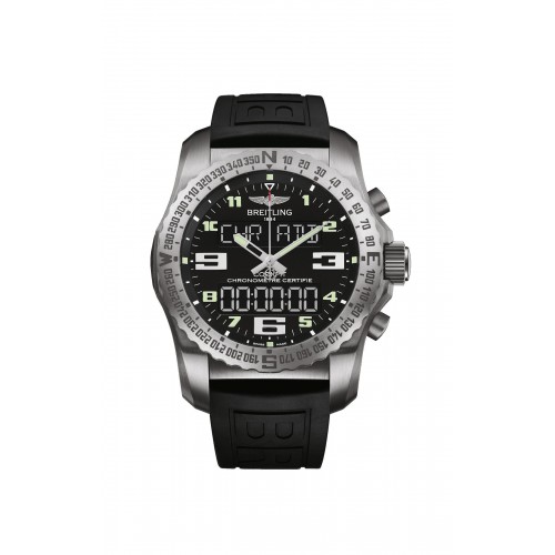 Description du produit : Montre Breitling Cockpit B50 Titane 46 mm. Référence : EB5010221B1S1. Acier titane. Cadran noir. Mouvement à quartz. Bracelet en caoutchouc noir et boucle déployante en titane.