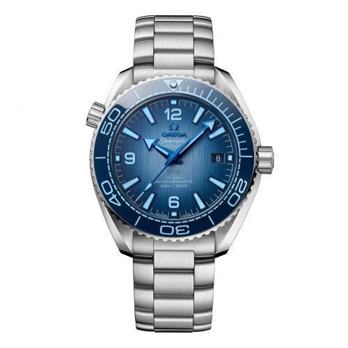 Le cadran en céramique brossée verticale, dans le bleu été emblématique d'OMEGA, est traité PVD et verni avec une finition dégradée reflétant le niveau d'étanchéité de la montre.