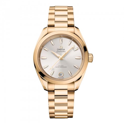 Ce modèle de 34 mm est fabriqué en acier poli Moonshine® 18 carats. La montre présente une couronne conique, un fond de boîtier aux bords ondulés et un verre saphir plat. Le cadran argenté soleillé et laqué est doté d'un guichet de date circulaire à 6 heures, entouré d'or Moonshine® 18 carats. OMEGA a également utilisé l'or Moonshine® 18 carats pour les aiguilles facettées et les index distinctifs, qui évoquent des coques de voiliers et sont remplis de Super-LumiNova® blanc. Elle est montée sur un bracelet assorti en or Moonshine 18 carats et animée par le calibre OMEGA 8801 Co-Axial Master Chronometer, certifié selon la norme industrielle la plus élevée par l'Institut fédéral suisse de métrologie (METAS).