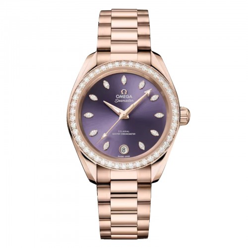 Ce modèle de 34 mm est réalisé en acier Sedna 18 carats. Le boîtier en or est doté d'une lunette pavée de diamants, d'une couronne conique et d'un fond à bords ondulés avec un verre saphir plat. Le cadran lavande, brossé et laqué avec traitement CVD, présente un guichet de date circulaire à 6 heures, entouré d'or Sedna 18 carats. Les index sont sertis d'or et de diamants. OMEGA a également utilisé de l'or Sedna 18 carats pour les aiguilles facettées. Elle est montée sur un bracelet assorti en or Sedna 18 carats et animée par le calibre OMEGA 8801 Co-Axial Master Chronometer, certifié selon les normes les plus exigeantes de l'industrie par l'Institut fédéral suisse de métrologie (METAS).