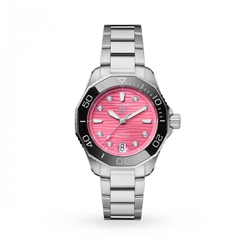 Offrant une interprétation élégante de la montre de plongée par excellence, le boîtier en acier inoxydable de 36 mm arbore une géométrie épurée, tandis que le cadran rose vif, orné d'un motif vague et d'index en diamants étincelants, affirme un style unique.